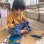 筆で描くだけでなくわざと水分を多く含ませてたらしてみたり、手や足の裏に塗って紙の上にペタペタしてみたり。ピンクやオレンジなどある色は使わず、色を組み合わせて自分だけの色を作ったり。