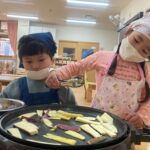 焼くときには「あぶらがはねるよ!」とお友だちに声をかけたり「何色になったら食べられるのかな?」と聞くと「すこしきいろになったらいいんじゃない?」「これはまだだよ!」と裏を確認してお友だちと相談する姿もありました。ひっくり返すときは「(さつまいもの)したにとんぐをいれるとやりやすいよ!」と気づいて教える場面もありました。机が少し奥に傾いていたのですが、あえて油が溜まっているところで焼こうとしたり。考える力がぐんぐん身についていますね。焼けるのを慎重に待ったり、「もういいかなー」とすぐに裏返して「まだ!」と怒られてしまったり😊性格が出るなあと感じました。