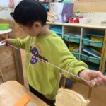 また、👦🏻「どのくらいがいいのかな」と紐の長さを困っているお友だちをみて、👧🏻「頭を測るといいよ」とお友だちの頭を紐で測る姿も見られました。