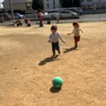 道中生えている葉っぱを触って「はっぱー」と口にしたり、室外機を見つけると「かんきせん!ついてないねえ」とお友だちとお話したり。コミュニティーセンターに着くと、職員と一緒にしゃぼんだまで遊ぶ子や、ボールを投げたり転がしたりして遊ぶ子、むっくりくまさんで、走り回る姿も見られましたよ。