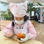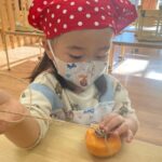 地域の方のお庭で収穫した柿をどうやって食べるか、子どもたちと話し合ったところ、「干し柿にしてみたい!」という意見が出たため、今日はみんなで干し柿作りに挑戦しました!