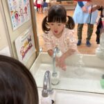 学んだことを早速、朝おやつの時間の手洗いで友達同士声に出しながら