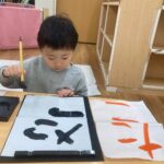 また、新しい半紙にぽとっと墨が落ちてしまい「あっ…」と残念そうにする子や、墨の量が難しく「びちょびちょになっちゃった」と戸惑う子もいましたが、これも大切な経験ですね。
