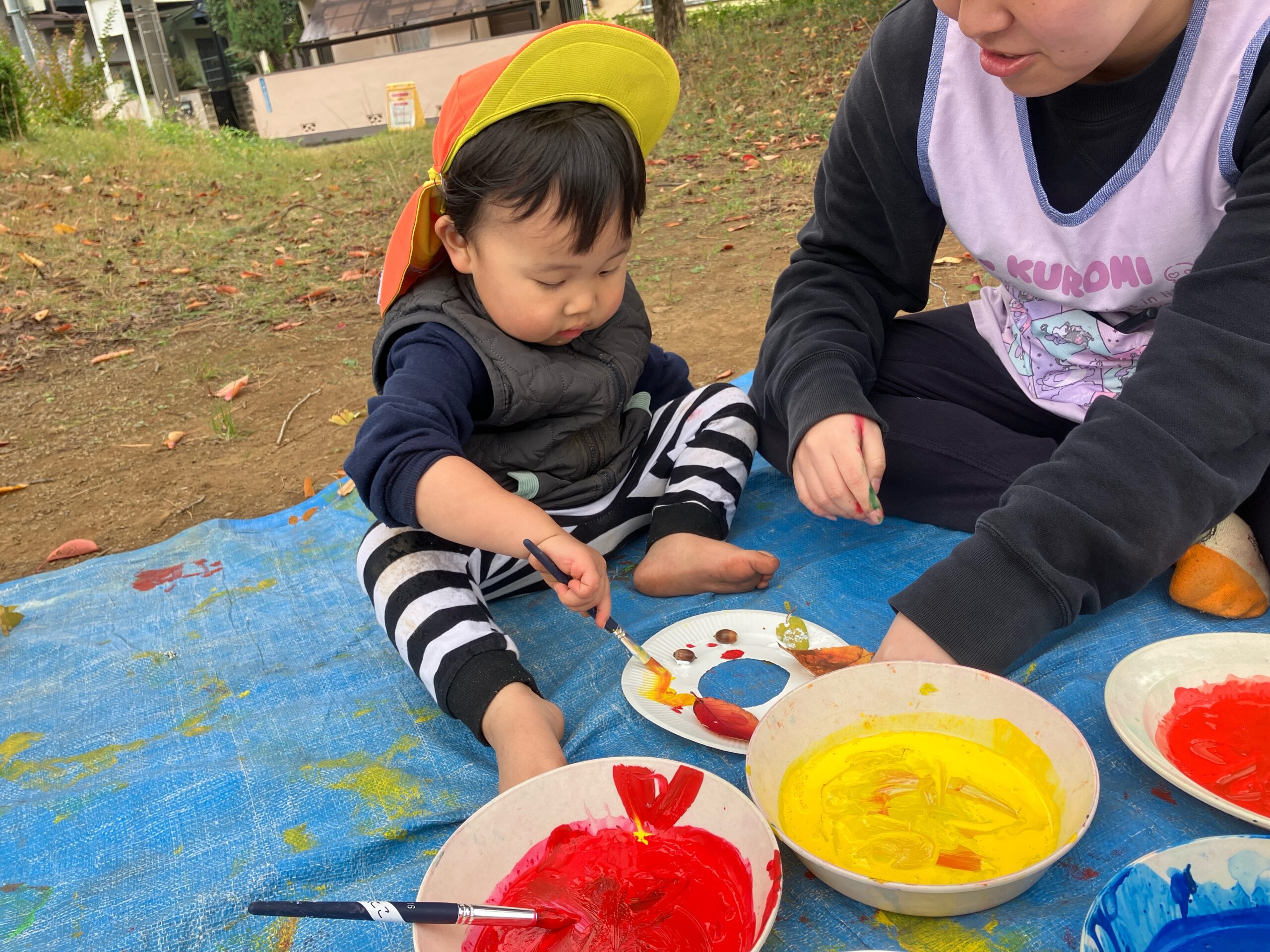 先週収穫したさつまいもを、じっくり見て・触って 絵の具で絵を描きました。 子どもA『つちがついてるね!』 子どもB『あっ!けがはえて…