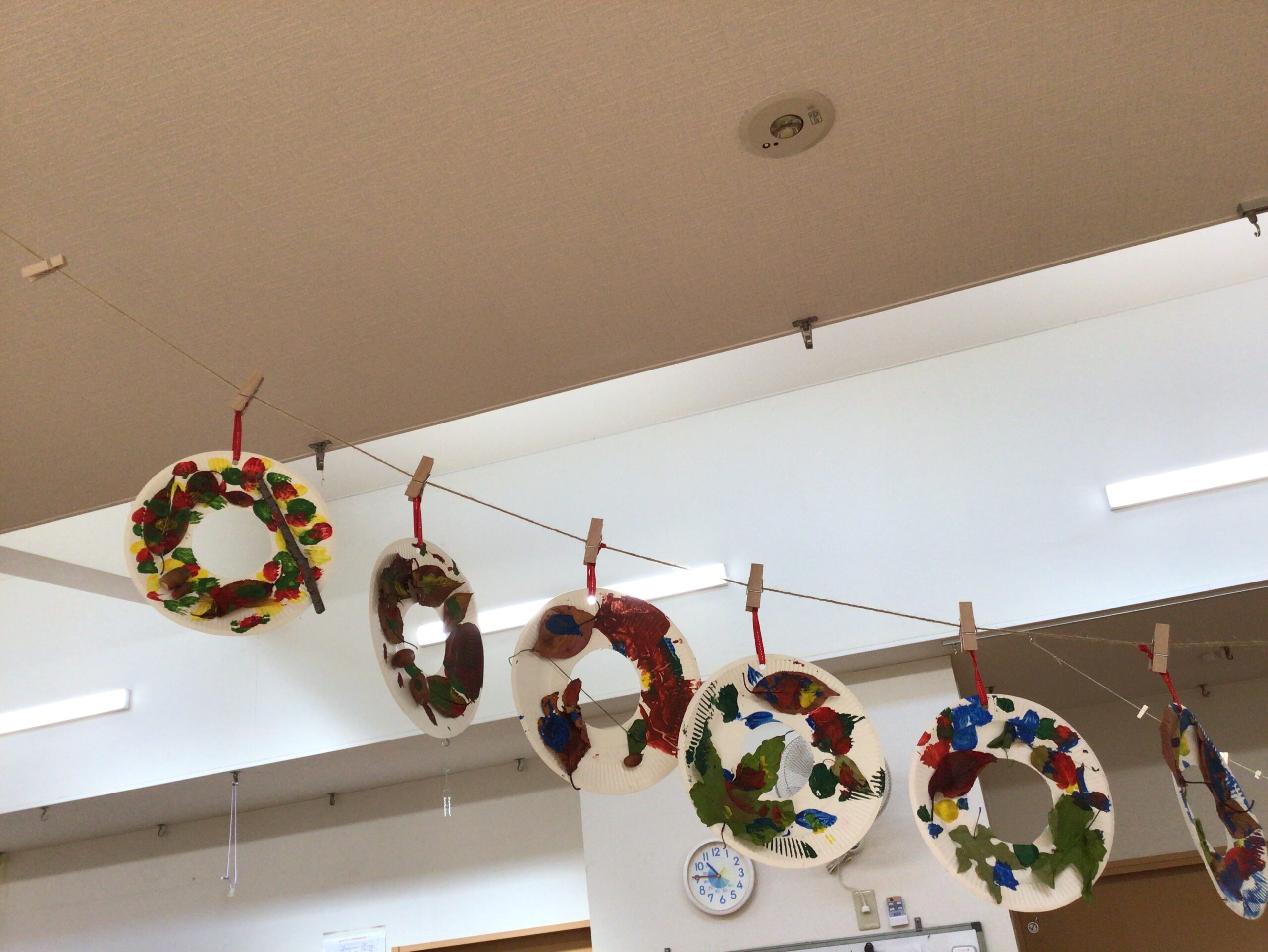 以前、赤松公園で散歩に行って自然物で制作したリースを保育室に飾ってみました! かざると早々に子どもたちが気付いて、 「あたしの!あた…