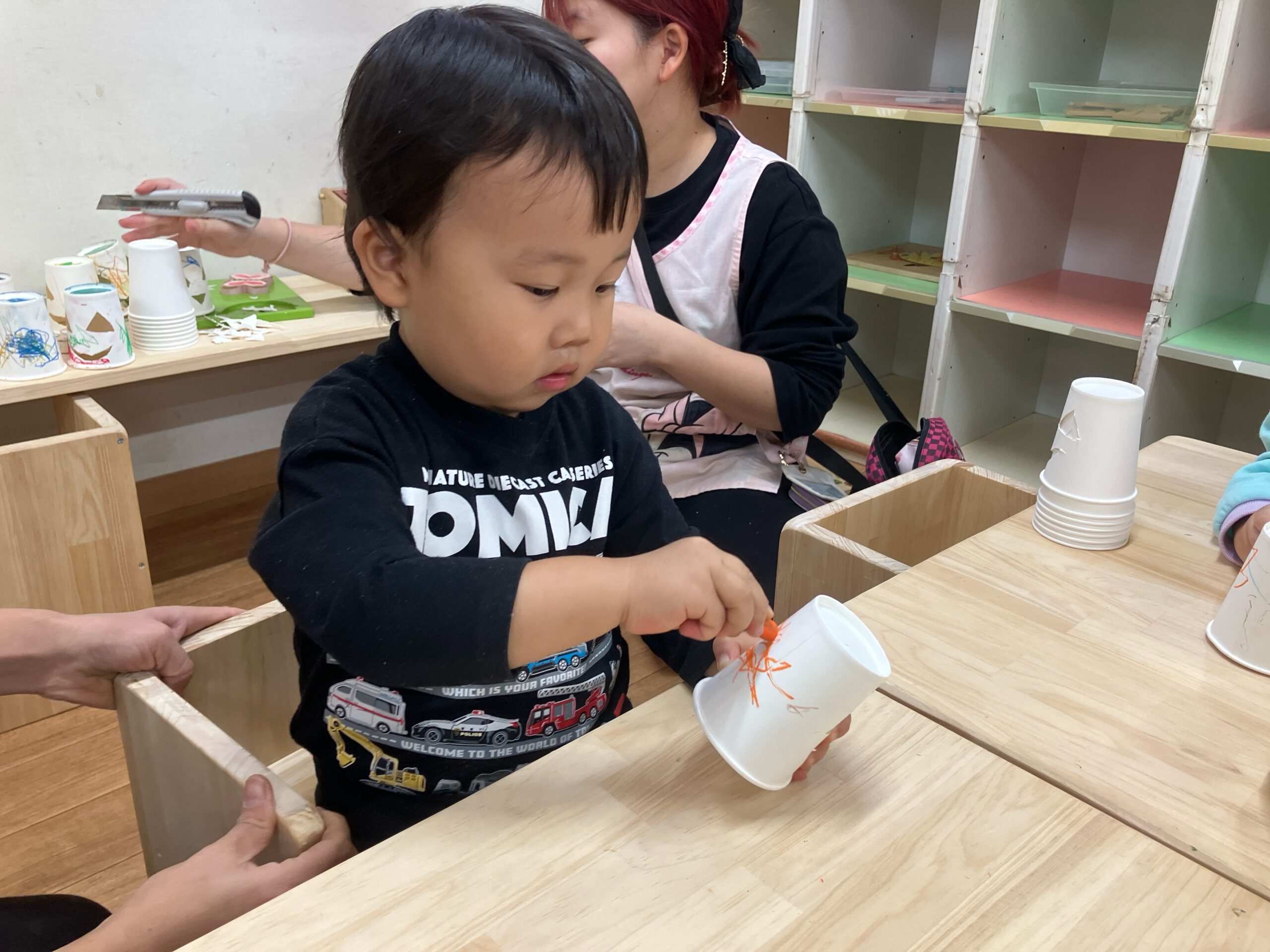 今日はハロウィンのジャック・オー・ランタンのイメージした 紙コップでの制作をしました! 「お化け怖くないよ!!」 「お化けは怖いんだ…