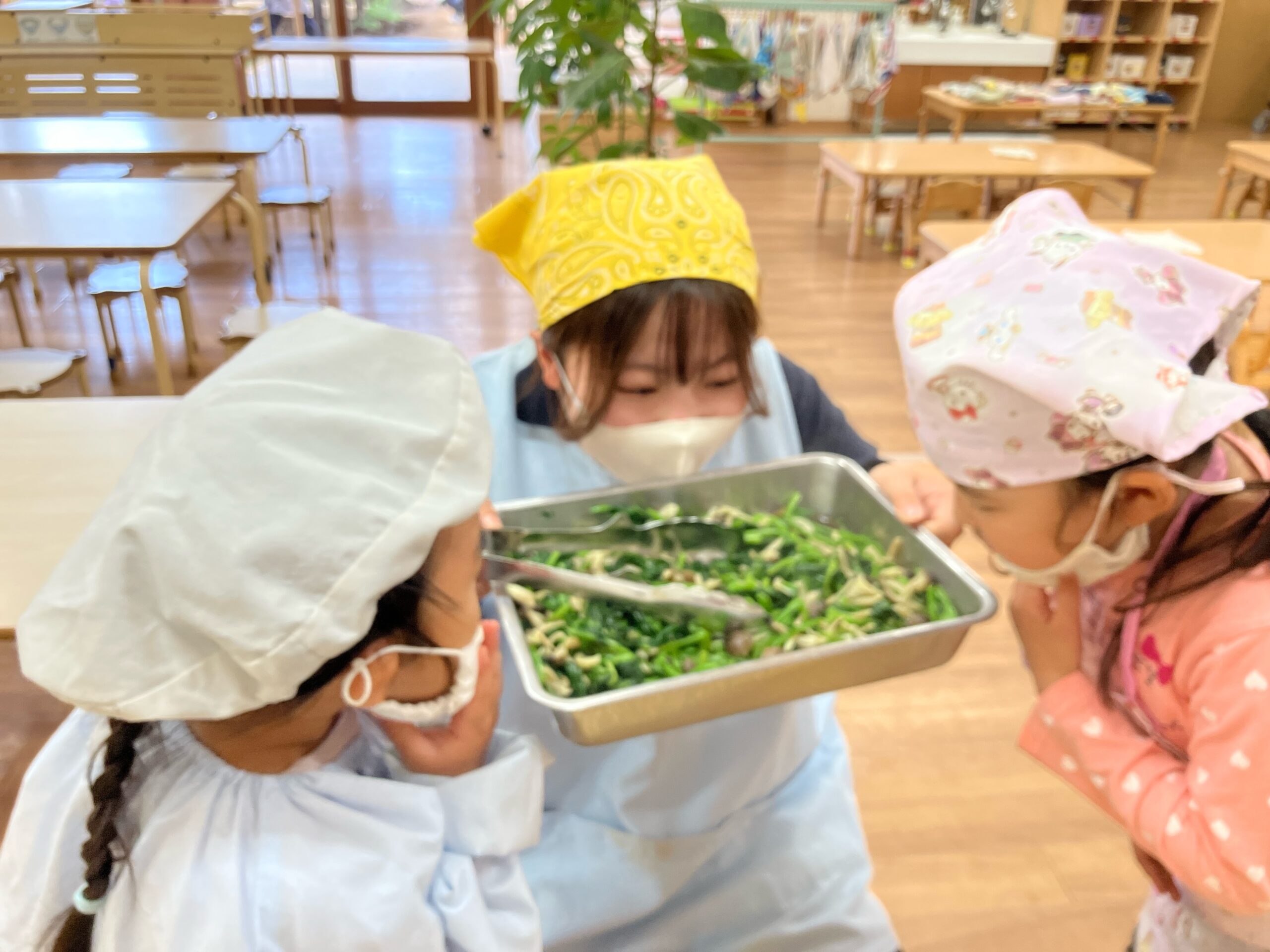 3歳児つきぐるーぷ、10月のクッキングを行いました! 今月は『自分でドレッシングをかけて食べてみよう!』ということで子どもたちも張り…