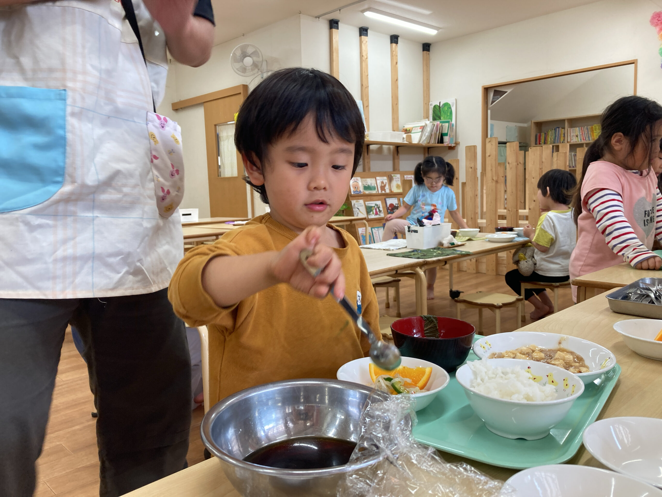 3歳児つきぐるーぷ、10月のクッキングを行いました! 今月は『自分でドレッシングをかけて食べてみよう!』ということで子どもたちも張り…